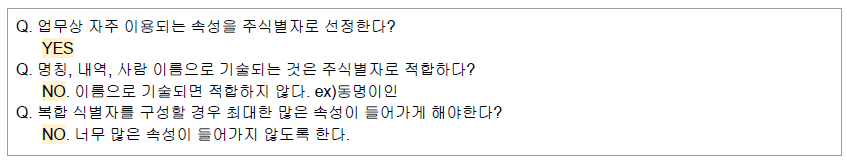 - 최소성 : 주식별자를 구성하는 속성의 수는 유일성을 만족하는 최소의 수가 되어야 함